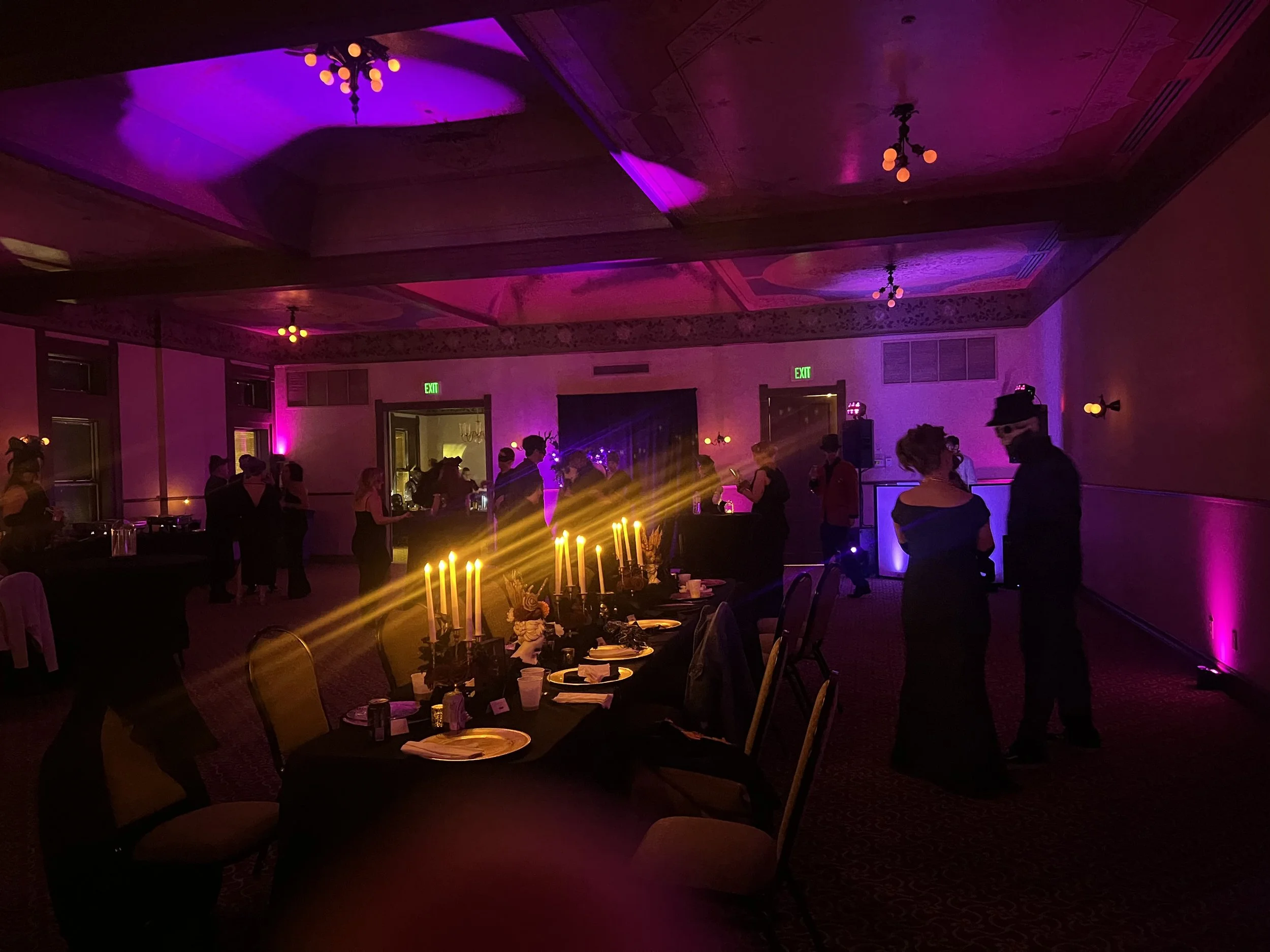 The ballroom itself still boasts original hand-stenciled ceilings and original light fixtures, each adding character and a little ghostly charm to the evening. Fountain Square’s rich history—once nearly lost to downtown decline—has been beautifully restored through major renovation efforts, making it a symbol of Bloomington’s revitalization. Its preserved architectural details and old-world atmosphere created the perfect setting for our elegantly spooky night.