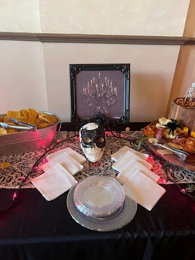 To transform the space into a haunted mansion dreamscape, we designed every detail with sophistication and eeriness in mind. Black linens, gold chargers, and black napkins created a dramatic, luxurious base that looked even more stunning than we imagined.